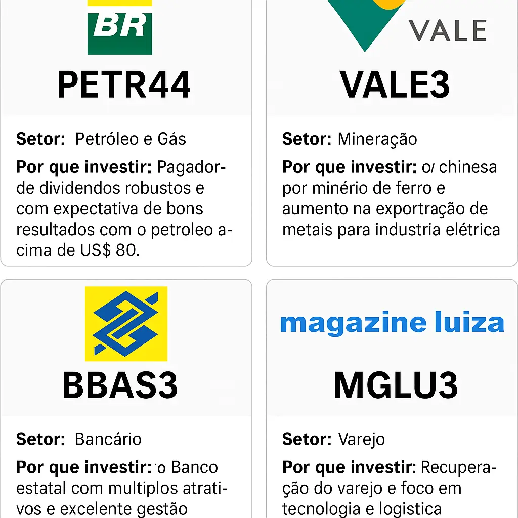 - Por que investir: Recuperação do varejo e foco em tecnologia e logística.